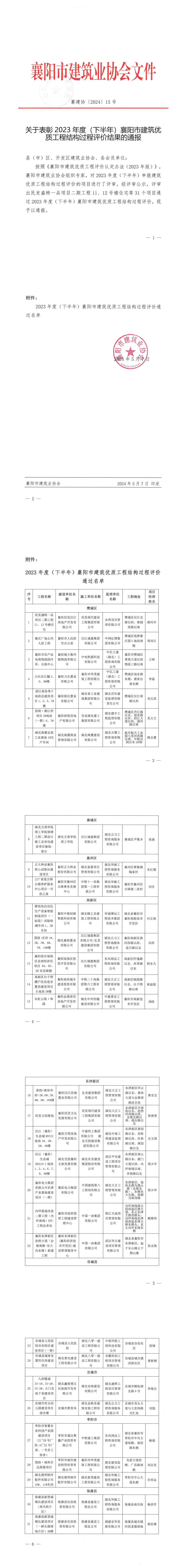 襄建協(xié)〔2024〕15號 關(guān)于表彰2023年度(下半年)襄陽市建筑結(jié)構(gòu)優(yōu)質(zhì)工程評審結(jié)果的通報